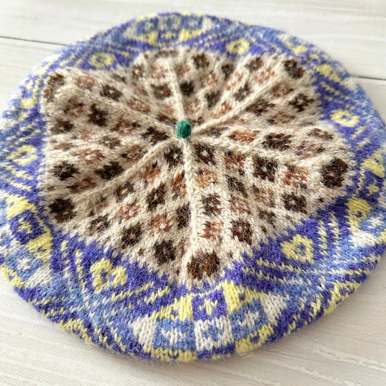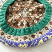 淡いベージュをベースに、パープルやイエローの幾何学模様が映える上品なベレー帽です♪