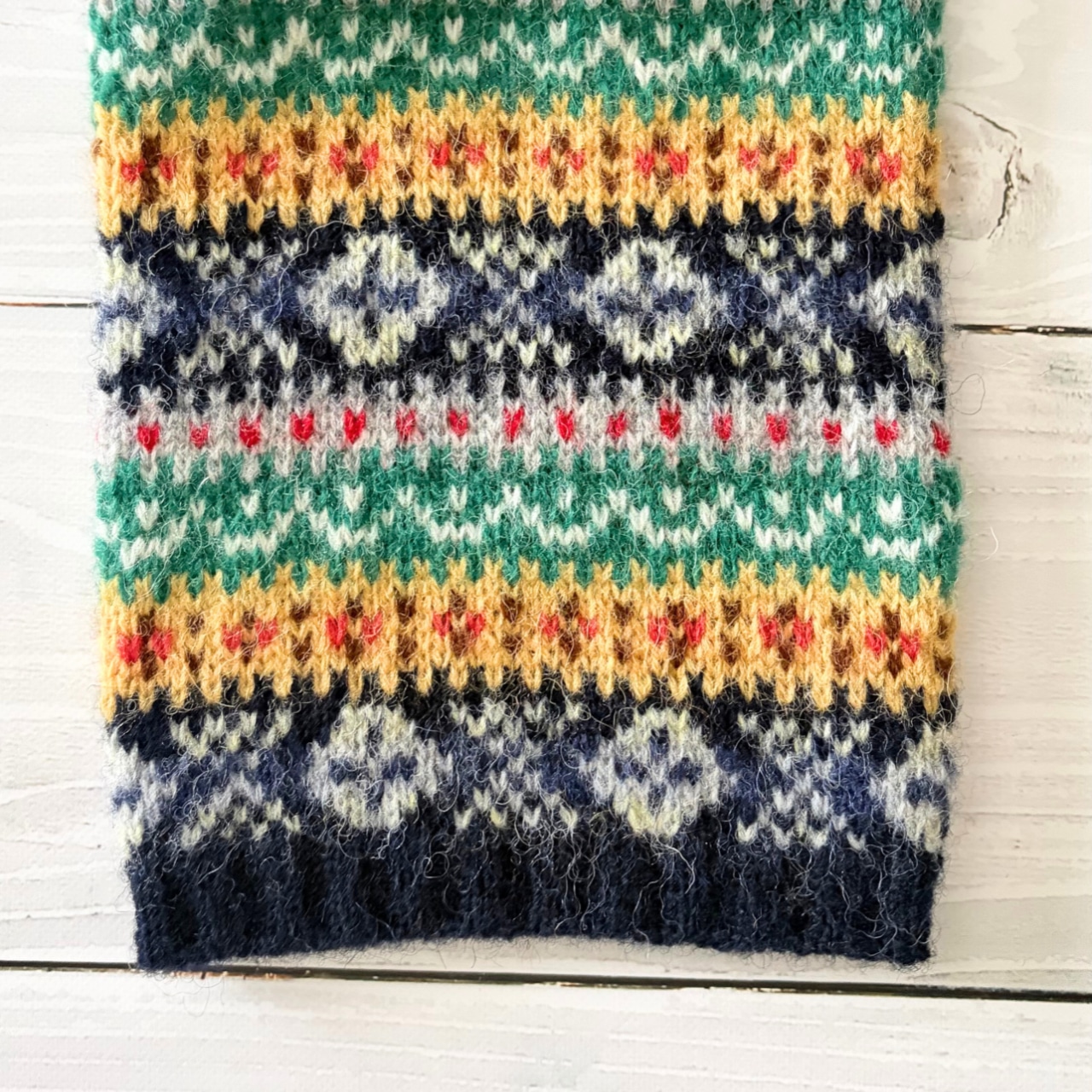 編みこみのフェアアイルが初めての方、筒の状態で編むのが初めての方にとっては、レッグウォーマーは最初のフェアアイルとしてお勧めの作品です!
